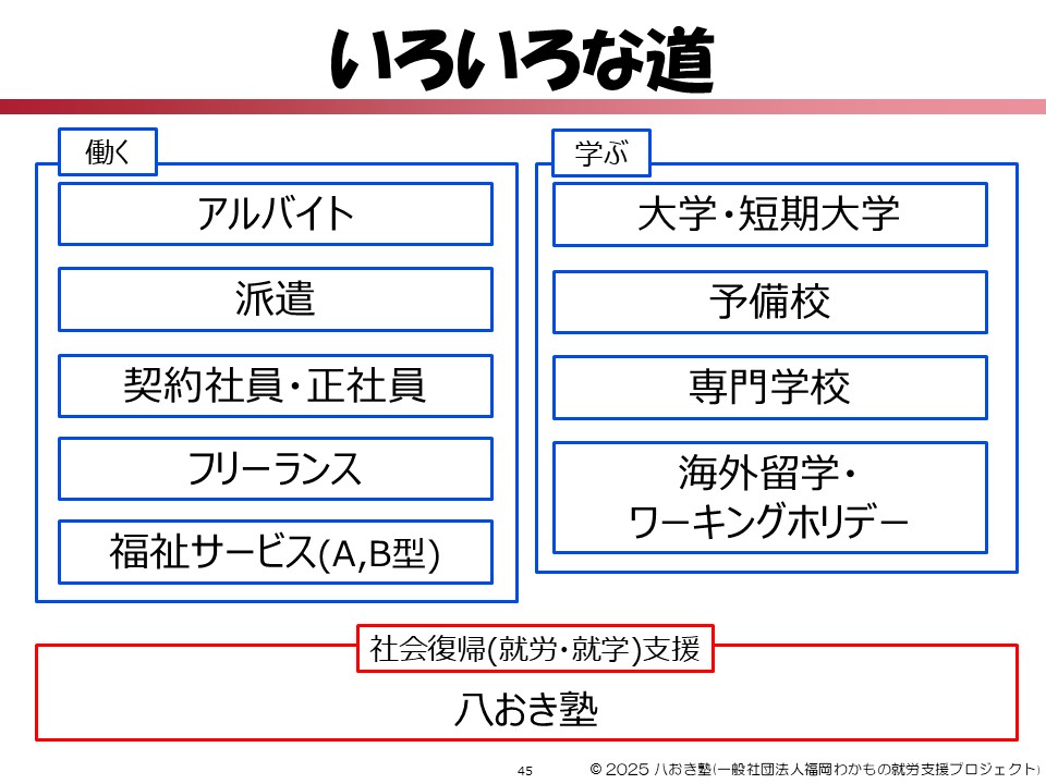 しかし、一番大事な事は諦めない事です。そのためには、コーチを付け一緒に頑張る。一人じゃないというのは、何をするにしても心強いです。そして、当面の目標「子どもを八おき塾に連れて行き、支援を受けさせる」を実現しましょう。